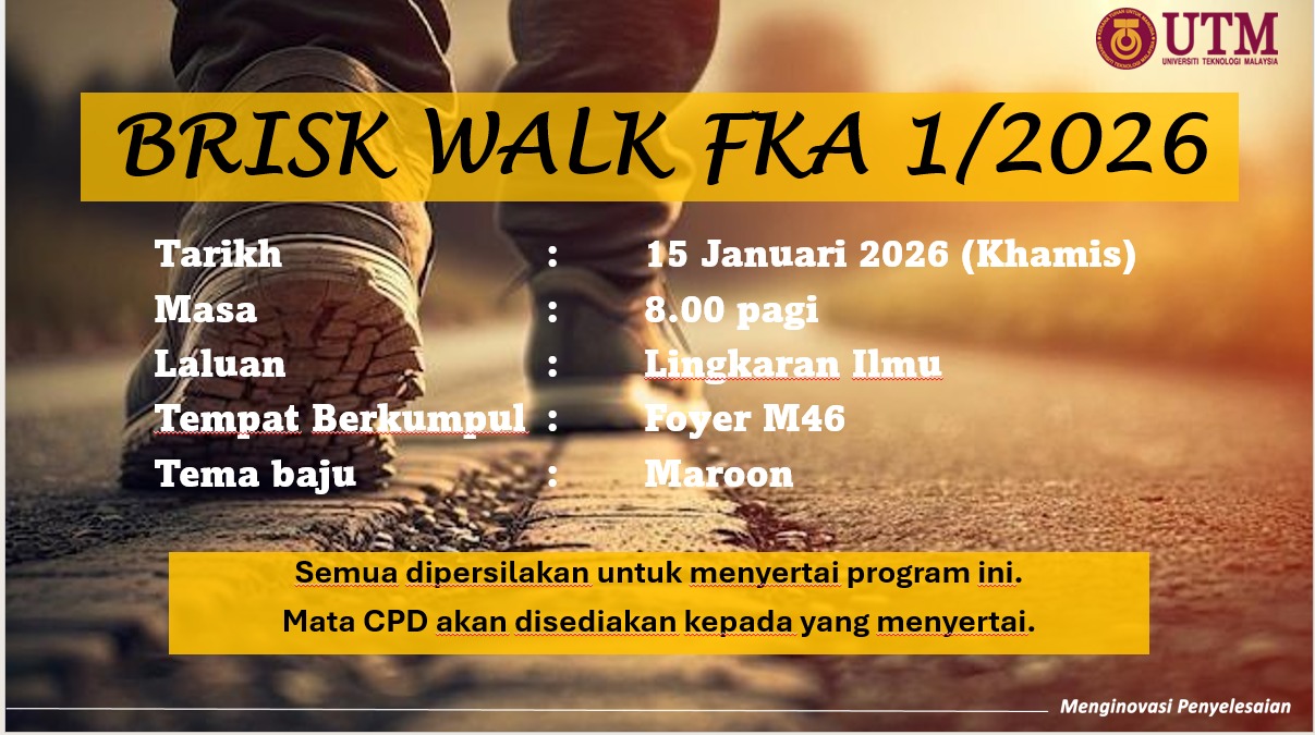 JOHOR BAHRU, 15 Januari 2026 – Dalam usaha memupuk budaya hidup sihat dan memperkukuh sinergi antara warga fakulti, Fakulti Kejuruteraan Awam (FKA) telah menganjurkan program Brisk Walk FKA 1/2026. Program ini merupakan inisiatif proaktif fakulti untuk memastikan kesejahteraan fizikal dan mental staf serta pelajar sentiasa berada pada tahap optimum, selari dengan tuntutan produktiviti akademik yang dinamik.