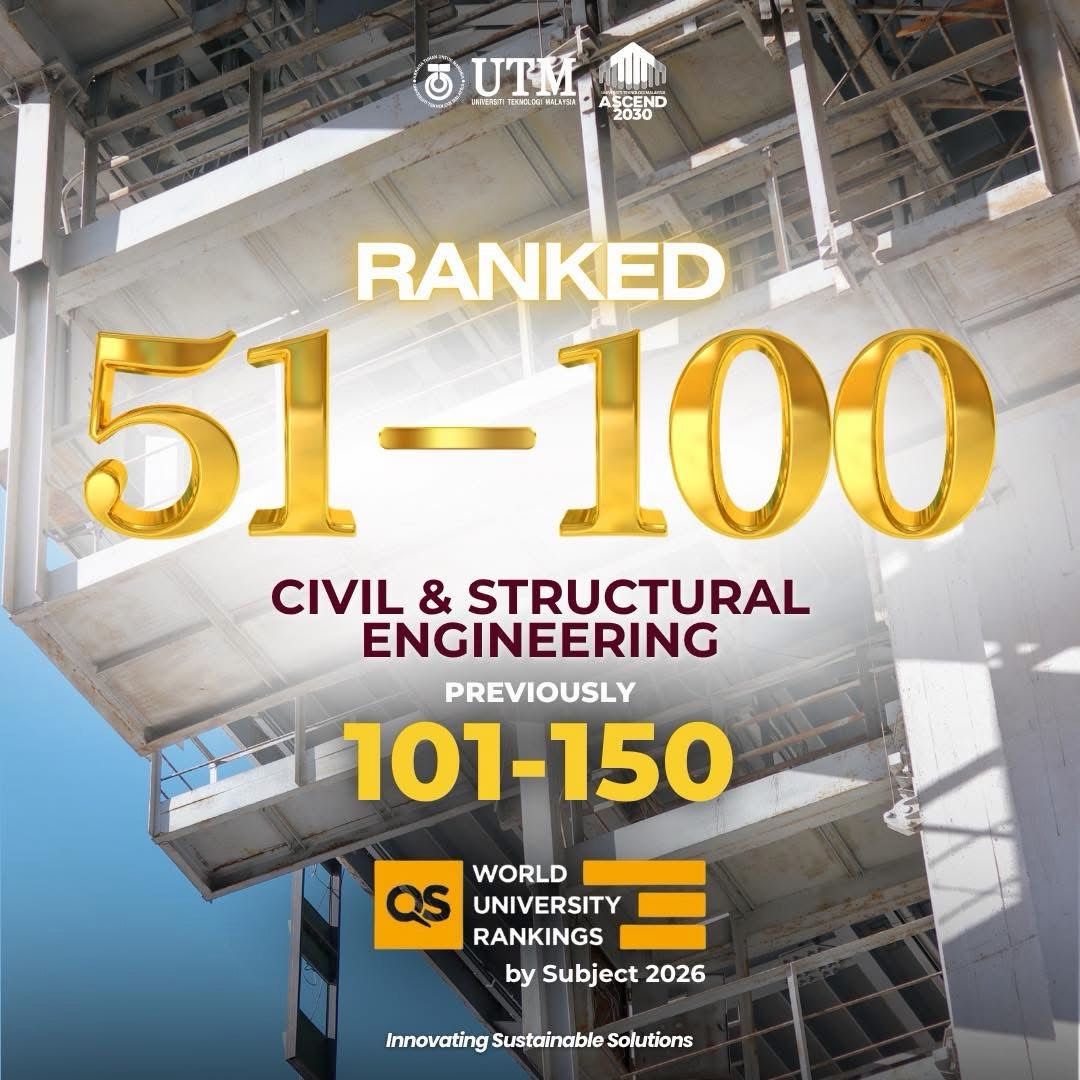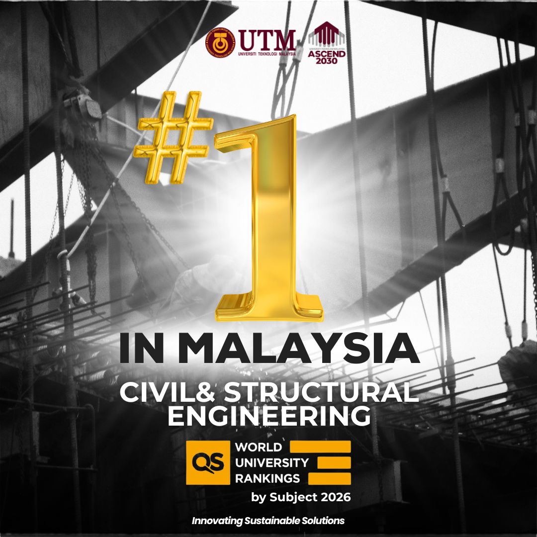 JOHOR BAHRU, 2026 – Fakulti Kejuruteraan Awam (FKA), Universiti Teknologi Malaysia (UTM) terus melakar kejayaan membanggakan apabila diiktiraf sebagai No. 1 di Malaysia bagi bidang Kejuruteraan Awam & Struktur, berdasarkan QS World University Rankings by Subject 2026.