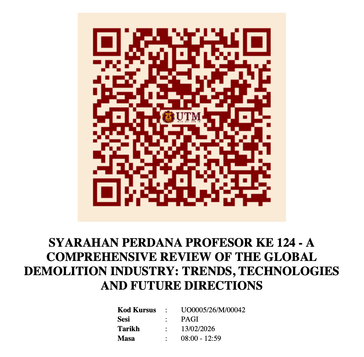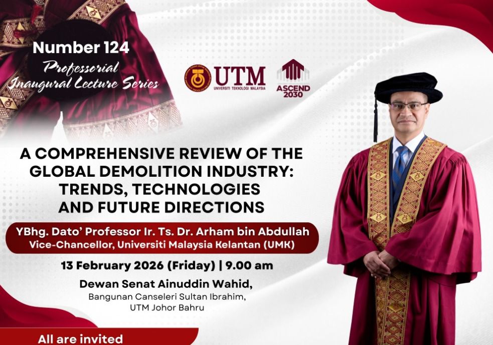 You are cordially invited to attend the 124th Professorial Inaugural Lecture Series organised by Universiti Teknologi Malaysia (UTM).