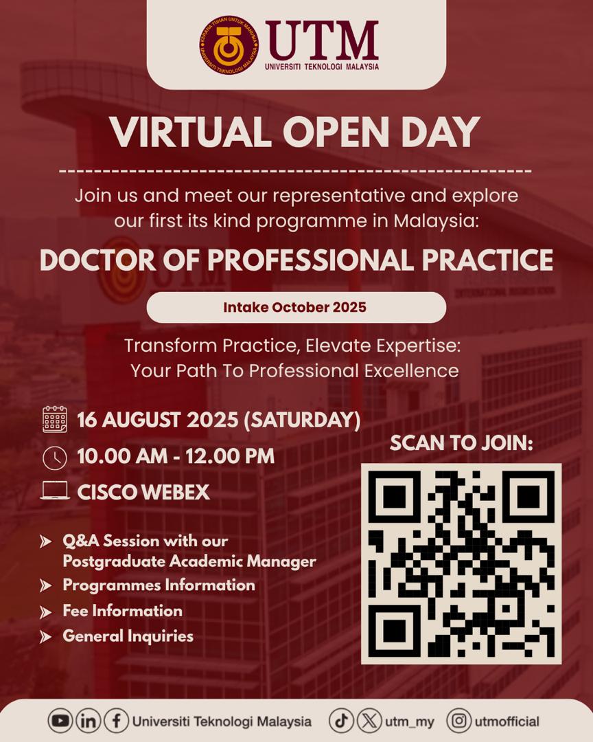 The Doctor of Professional Practice program, the first of its kind in Malaysia, is a collaborative effort by eight engineering, science, and technology faculties of UTM. It offers a balanced blend of taught coursework and research activities. Candidates will engage in eight cutting-edge courses and complete a capstone project, enabling professionals to apply their extensive practical experience to doctoral-level research. (more)