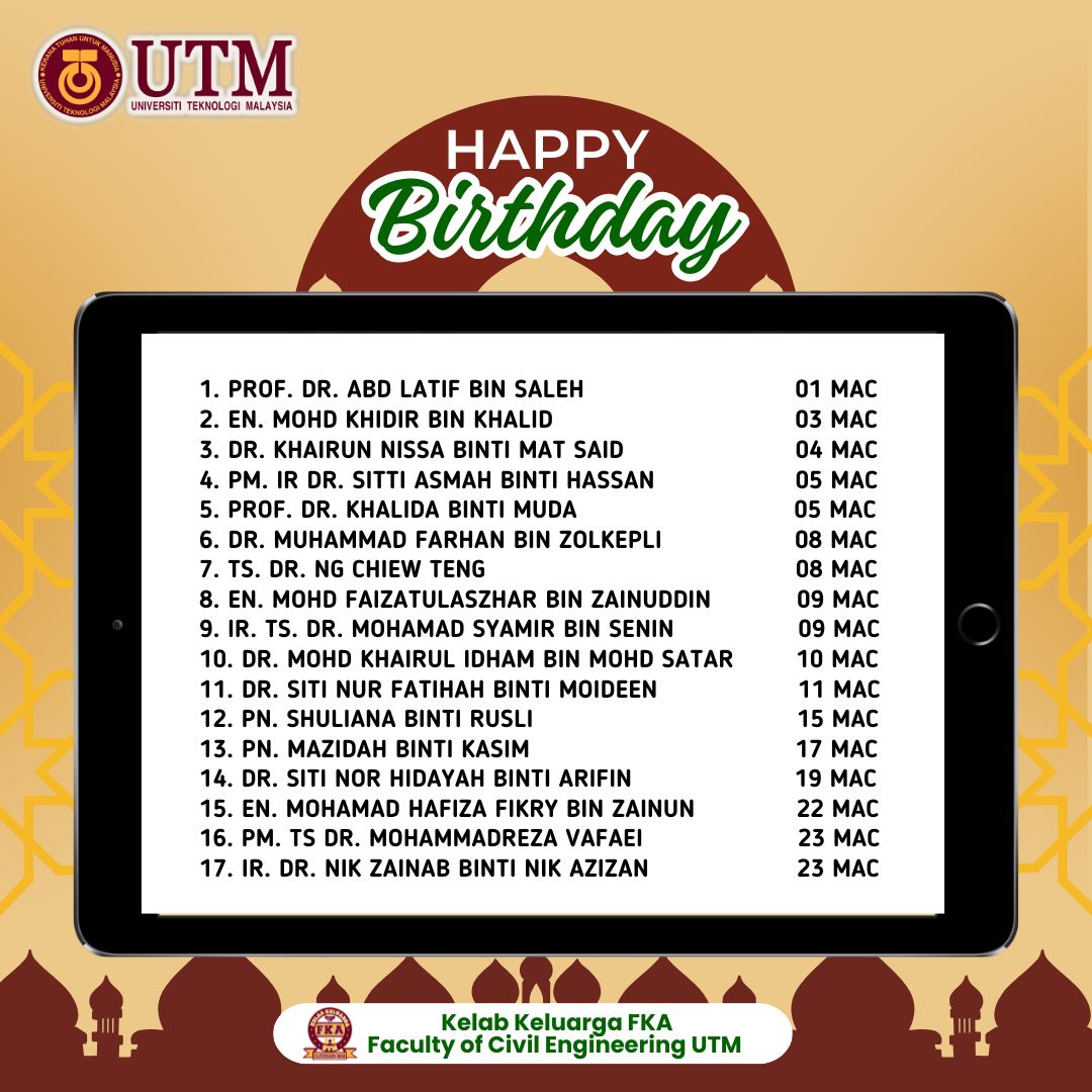 Seluruh warga Fakulti Kejuruteraan Awam (FKA), UTM ingin mengucapkan Selamat Hari Lahir kepada semua staf yang menyambut hari kelahiran pada bulan Mac ini.