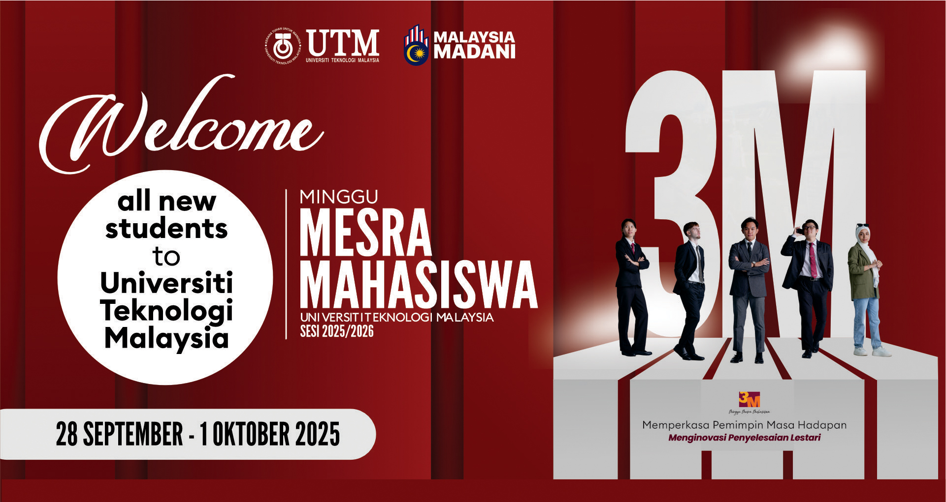 Universiti Teknologi Malaysia (UTM) mengalu-alukan kedatangan semua pelajar baharu ke Minggu Mesra Mahasiswa (3M) yang akan berlangsung pada:
