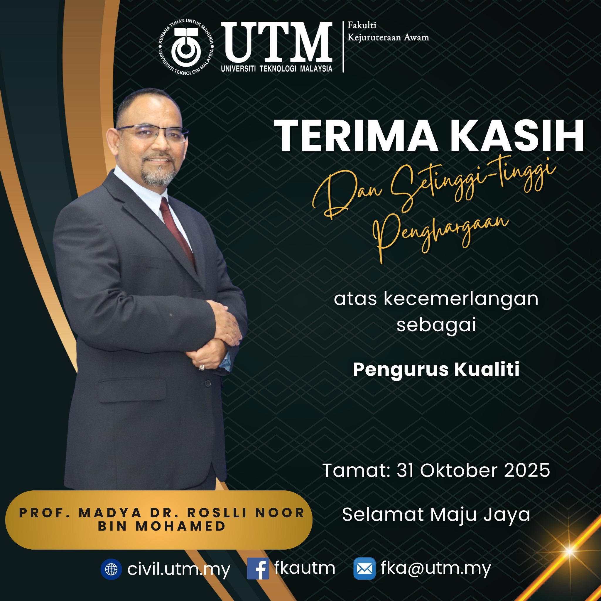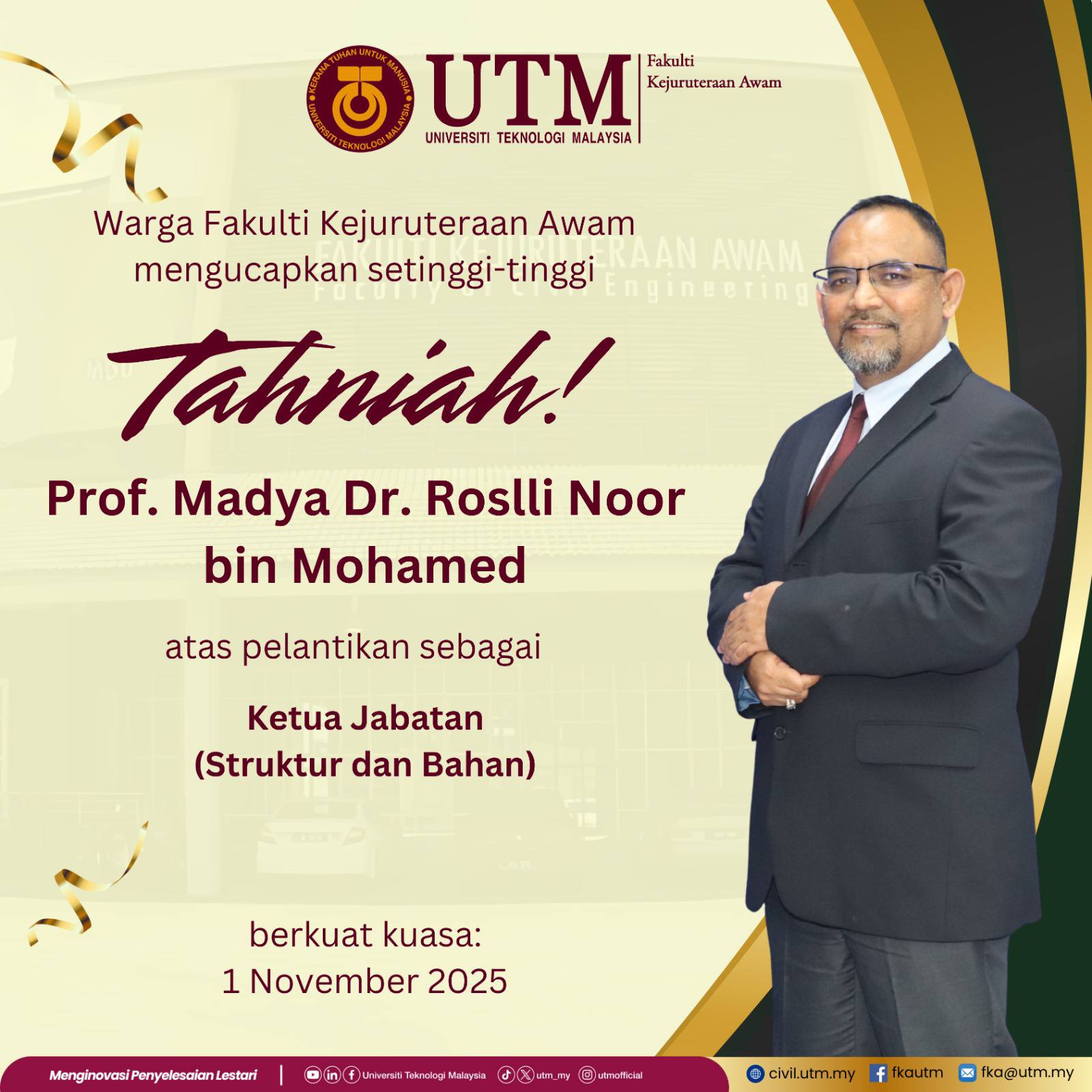 Tahniah kepada Prof. Madya Dr. Roslli Noor bin Mohamed atas pelantikan sebagai Ketua Jabatan Struktur dan Bahan, Fakulti Kejuruteraan Awam (FKA) berkuat kuasa 1 November 2025.