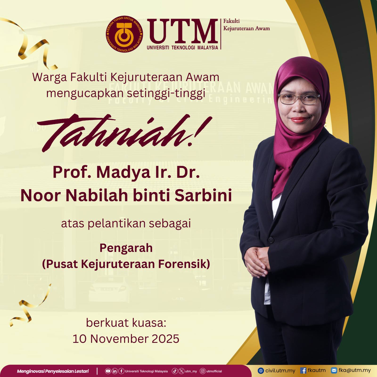 Tahniah kepada Prof. Madya Ir. Dr. Noor Nabilah binti Sarbini atas pelantikan sebagai Pengarah (Pusat Kejuruteraan Forensik), Fakulti Kejuruteraan Awam (FKA) berkuat kuasa 10 November 2025.