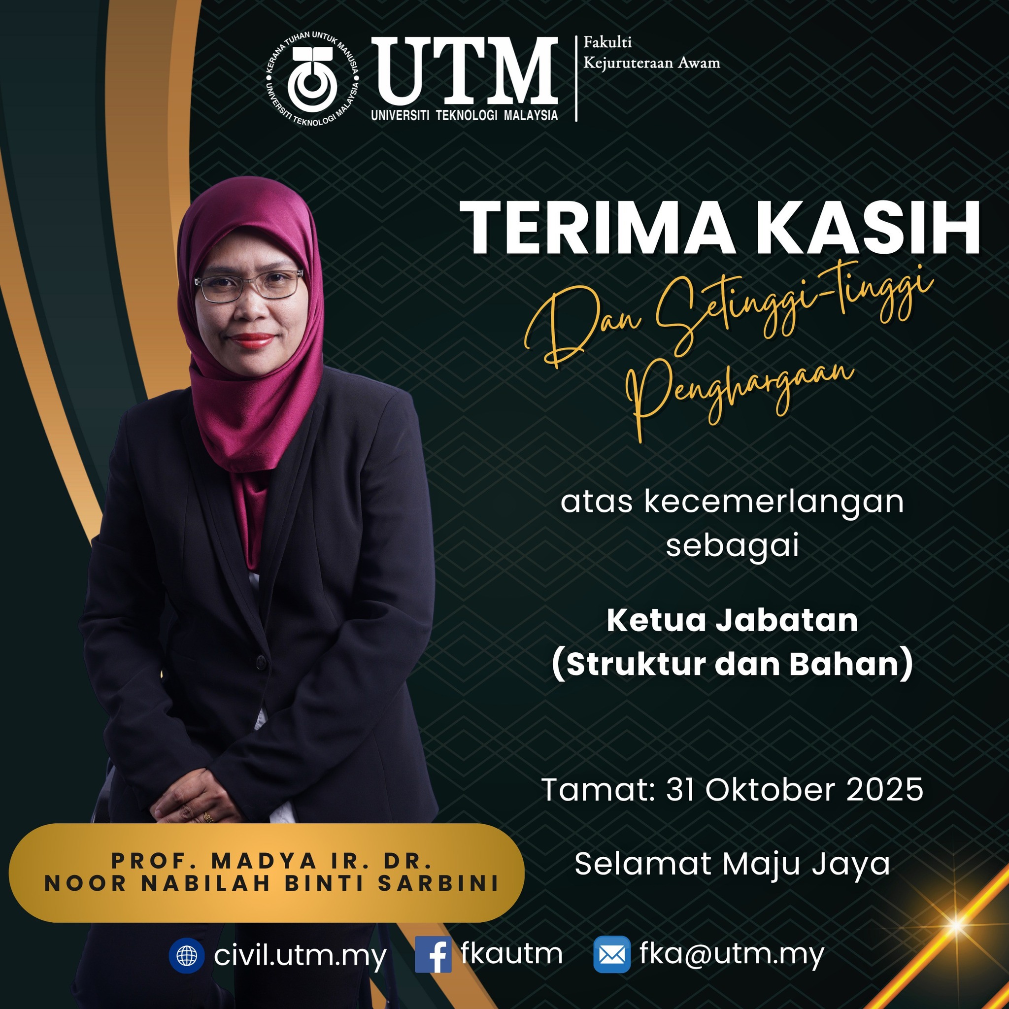 Setinggi-tinggi ucapan terima kasih dan penghargaan turut dirakamkan atas khidmat bakti dan kepimpinan beliau sebagai Ketua Jabatan (Struktur dan Bahan) FKA yang berakhir pada 31 Oktober 2025.