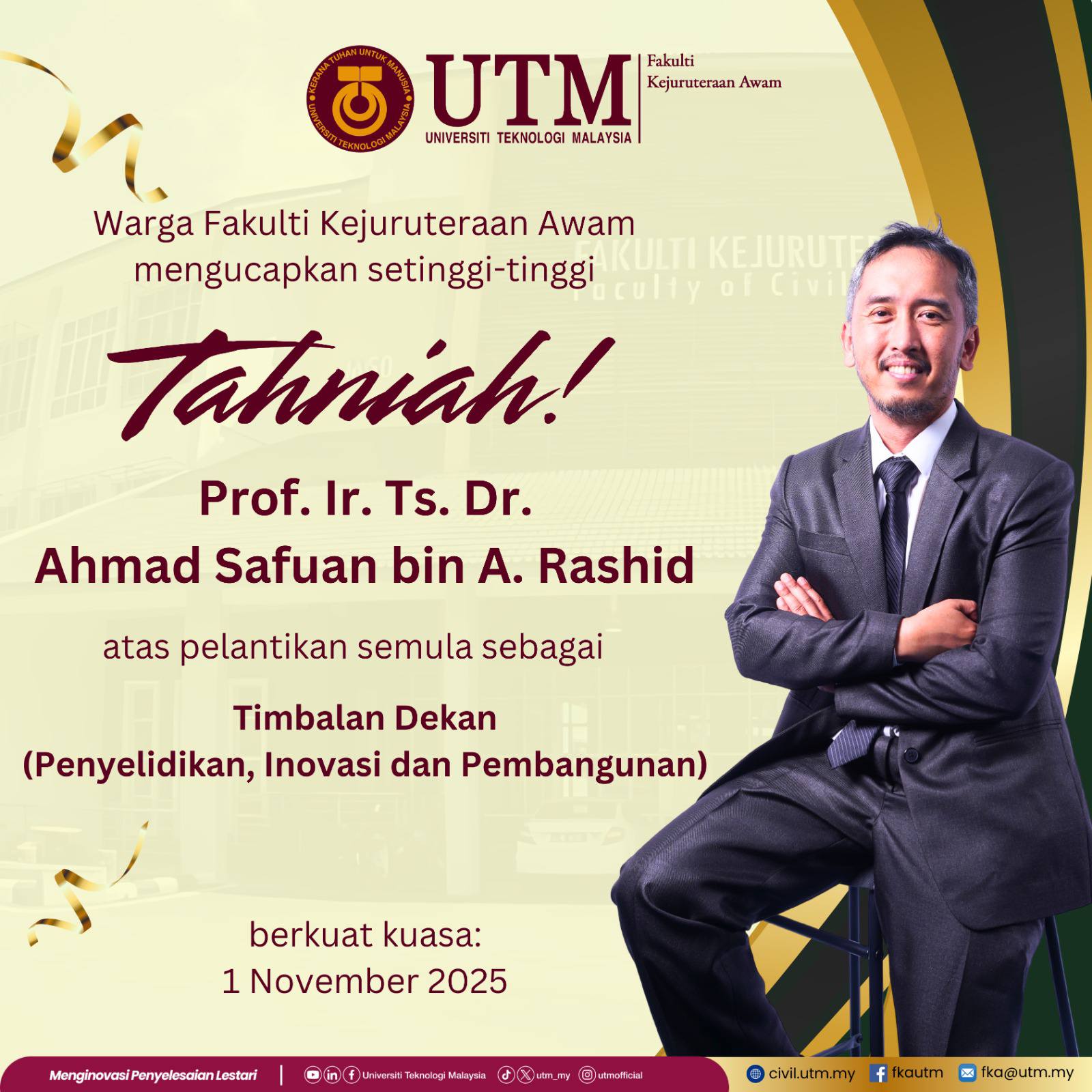 Tahniah dan Penghargaan Tahniah kepada Prof. Madya Ir. Dr. Noor Nabilah binti Sarbini atas pelantikan sebagai Pengarah (Pusat Kejuruteraan Forensik), Fakulti Kejuruteraan Awam (FKA) berkuat kuasa 10 November 2025. Setinggi-tinggi ucapan terima kasih dan penghargaan...