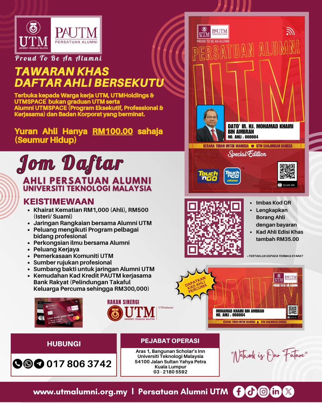 Pendaftaran adalah mudah — imbas Kod QR pada poster atau layari laman rasmi www.utmalumni.org.my